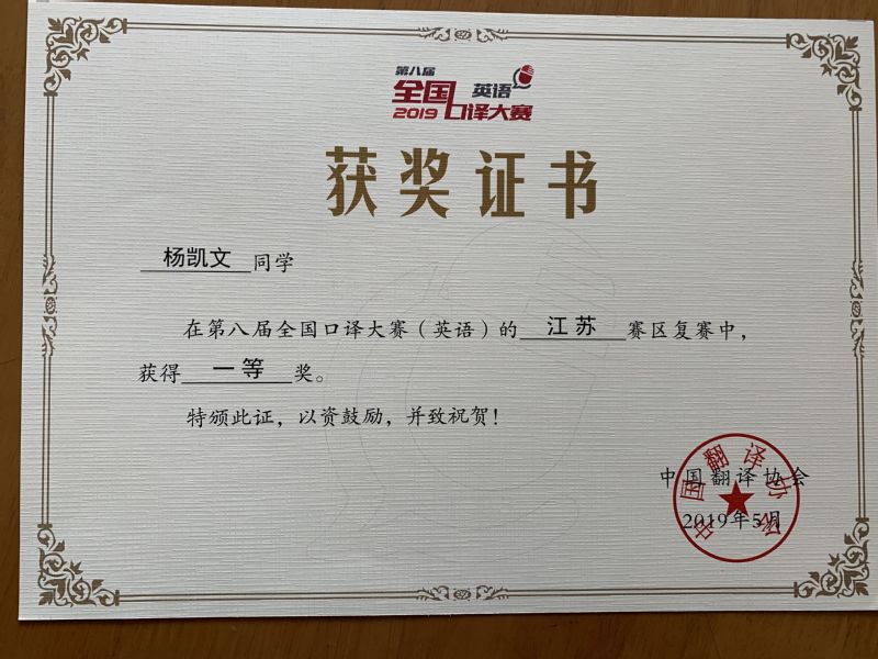 我院7名同学参加口译大赛,其中, 15级翻译班杨凯文同学荣获江苏省复赛一等奖及东部大区赛三等奖,褚博文、张楚璇、朱亚星、周阳楠、是煜、杨嘉辉荣获江苏省复赛三等奖。
