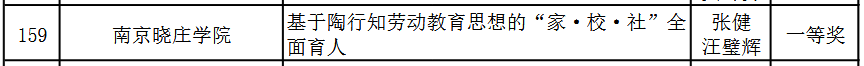 近日,江苏省高等教育学会组织开展的江苏省第二届高等学校劳动教育优秀实践项目评选结果揭晓。本次评选中,江苏各高校及研究会共限额推荐项目433项,经专家组评议与评审工作组审定,最终评选出优秀实践项目369项,其中特等奖65项、一等奖152项、二等奖152项。我院教师张健、汪璧辉报送的《基于陶行知劳动教育思想的“家·校·社”全面育人》项目荣获一等奖。