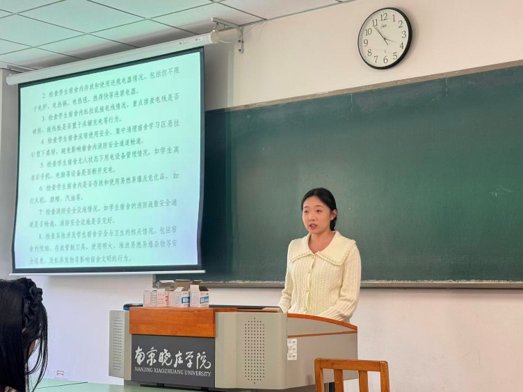 最后,班长陆梦萦再次强调宿舍安全管理要求,提醒同学们自查充电设备,杜绝使用违禁电器,共同维护安全和谐的居住环境。同时,她就“行知先进班级体”创建工作进行动员,希望全班同学凝心聚力,在新学年携手共进,争创佳绩。