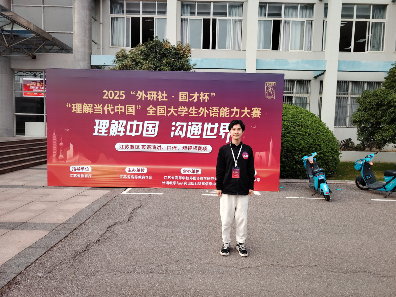 2025年11月1日至2日,“外研社·国才杯”“理解当代中国”全国大学生外语能力口译大赛江苏赛区决赛在河海大学顺利举行。南京晓庄学院外国语学院的张瑞同学,与全省各高校的优秀选手同台竞技,凭借出色的口译水平和稳定的临场发挥,荣获三等奖。