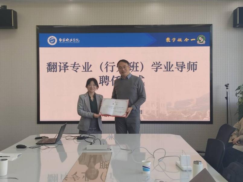 讲座结束后,学院举行了翻译专业(行知班)学业导师聘任仪式,正式聘请曹主任担任该班学业导师,并现场颁发聘任证书。此举标志着“行知班”在深化人才培养模式改革方面迈出关键一步。作为新形势下应用型、个性化、高素质外语人才培养的重要探索,聘请校外专家担任学业导师,不仅能够为学生提供前沿的行业洞察与一线实践指导,更有助于打破传统教学边界,推动产教融合走深走实。这一举措进一步强化了“行知班”的育人特色,为课程创新与师资建设注入了持续动能,对培养具备实战能力与创新思维的高层次翻译人才具有重要意义。