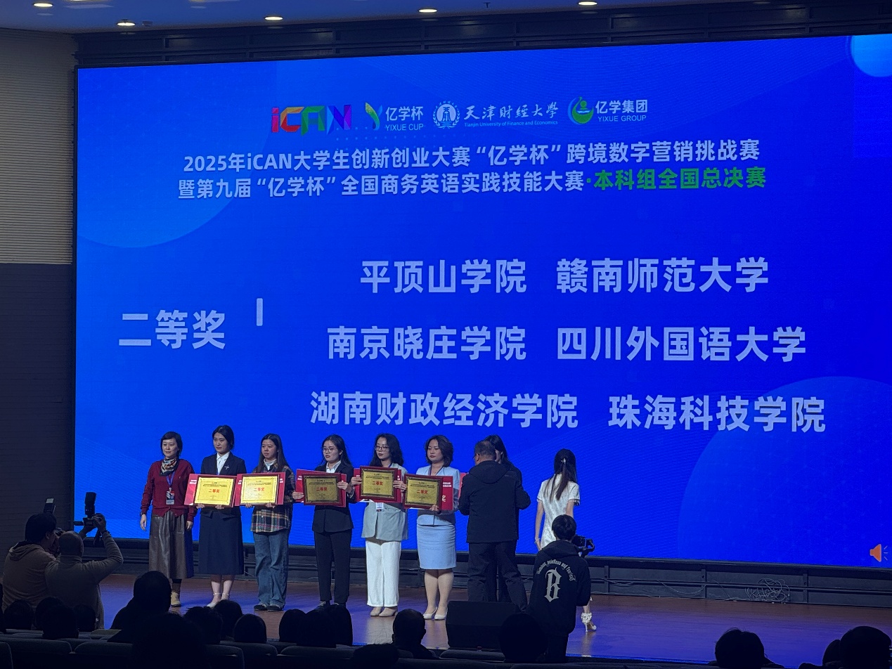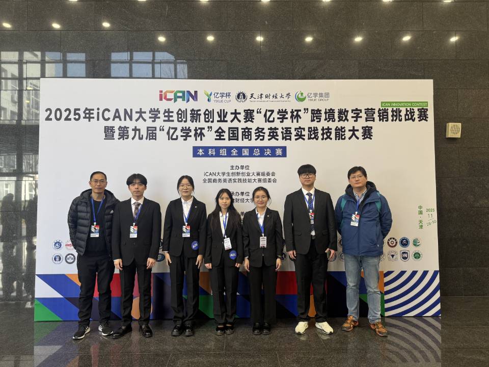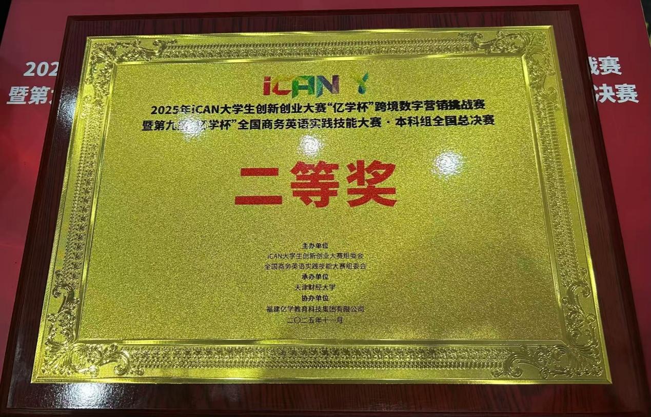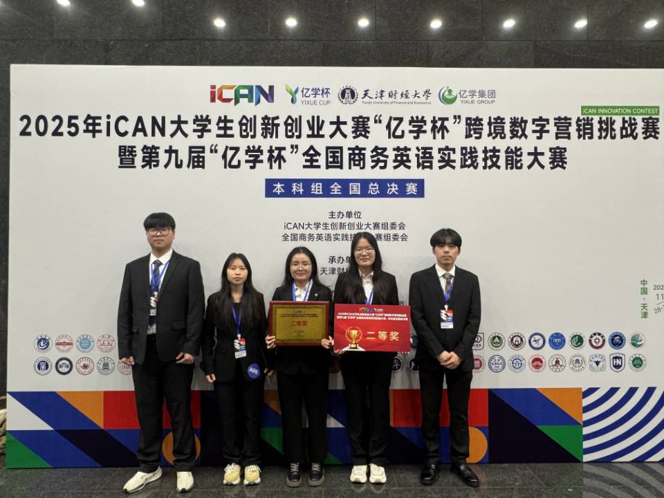 11月28日至30日,2025年iCAN大学生创新创业大赛“亿学杯”跨境数字营销挑战赛暨第九届“亿学杯”全国商务英语实践技能大赛全国总决赛在天津财经大学举行。由外国语学院商务英语专业钱昱宏、张倩、朱梦如、于静、顾嘉铭五位同学组成的Obsidian团队,在安在国、黎令两位老师的指导下,凭借出色表现荣获本科组全国二等奖。