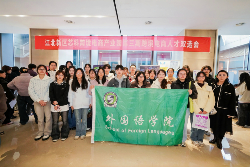 11月26日下午,外国语学院23名学生和商学院15名学生由外院商务英语教研室朱一童老师带队,参加江北新区芯科跨境电商产业园第三届跨境电商人才双选会。