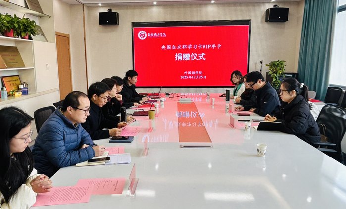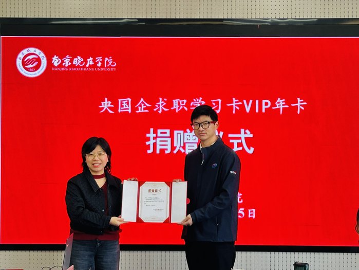 12月25日,“央国企求职学习卡”捐赠仪式在南京晓庄学院方山校区崇一楼举行。江苏在学信息科技有限公司董事长陈大千、行政总监兼未来云校副总经理吕丹一行,南京晓庄学院教育发展基金会办公室副主任黄丹、外国语学院党委书记王静萍、副院长沈红伟、辅导员、毕业生代表共同参会,捐赠仪式由外国语学院党委副书记、副院长马晓亮主持。