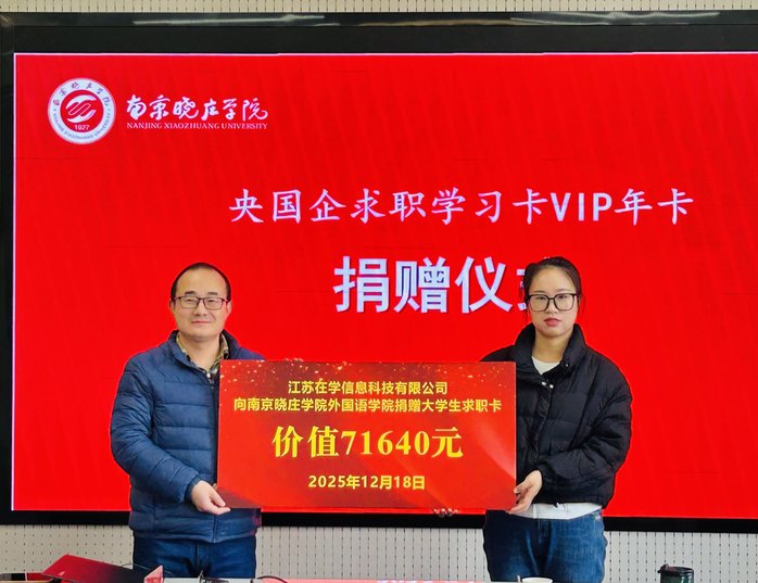 此次捐赠仪式的成功举办,不仅为外国语学院学子打通了就业“最后一公里”,更搭建起校企协同育人的新桥梁。校企双方的深度联动,彰显了企业的社会责任担当,也生动诠释了校企合作共育人才的初心。未来,南京晓庄学院外国语学院将与江苏在学信息科技有限公司持续深化合作,在就业指导、实习实践、人才培养等领域探索更多合作路径,凝聚育人合力,深化产教融合,助力学子实现职业理想。