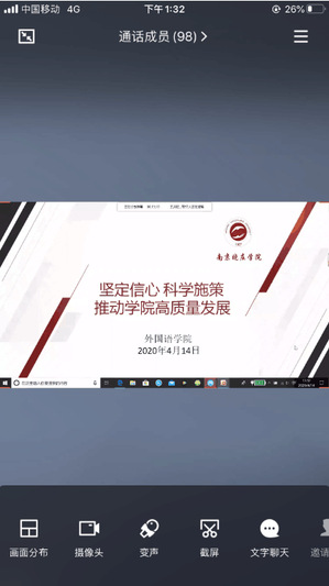 4月15日下午,外国语学院召开了全体教职工网络视频会议。首先,执行院长王静萍传达了学校近期相关文件精神,明确了学院2020年的重点工作,强调在切实做好疫情期间的各项教学工作同时,提高师德素养,加强专业建设,提升人才培养质量。王院长还通报了外院学生返校的相关信息和返校后的工作安排,特别提醒了教师和班主任在学生返校后的工作注意事项。教学副院长汪璧辉在会议上强调了疫情期间线上教学和毕业论文指导等方面的要求,部署了学生返校后的各项教学工作,呼吁全体教师不仅要关注学生的学习,还要关心学生的身心健康,将各项工作做实做细,切实保障特殊时期的教学质量。