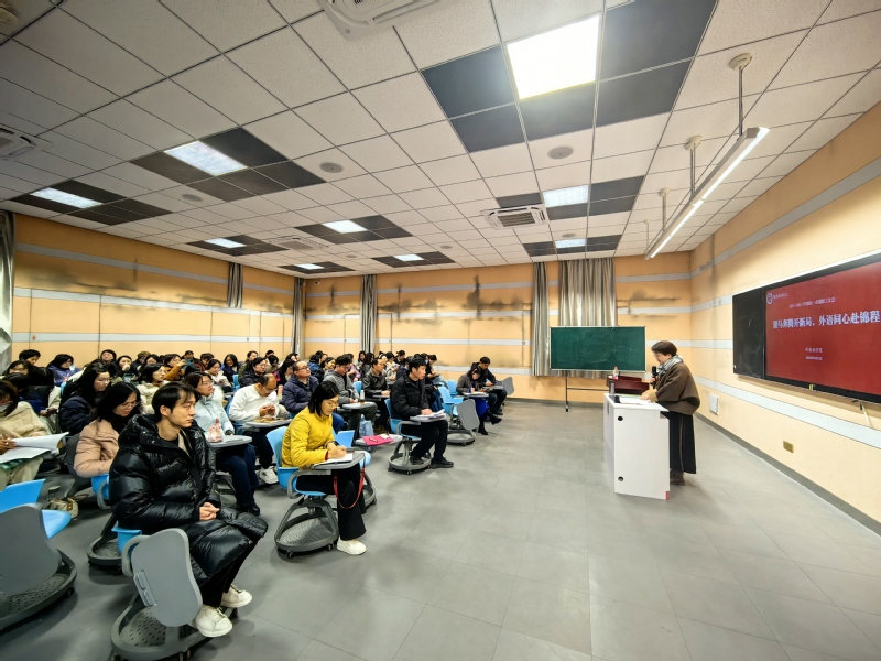 随后,汪璧辉院长通报了上学期期末工作及本学期重点工作。在2025年度的高质量考核中,外国语学院位列全校第一等次,她肯定了全体教职工的努力。就个人的岗位绩效考核情况,汪院长从总体的达到率、不同岗位达到率以及科研分几个维度进行了分析,指出存在的问题和不足,提出了改进的措施和方向。沈红伟副院长就开学的重点工作进行了部署,传达了学校教学工作的重点和改革任务。通报了开学巡课情况,并对本科教育教学审核评估整改、人才培养方案修订、学科竞赛工作、校级质量工程等工作作出具体安排。