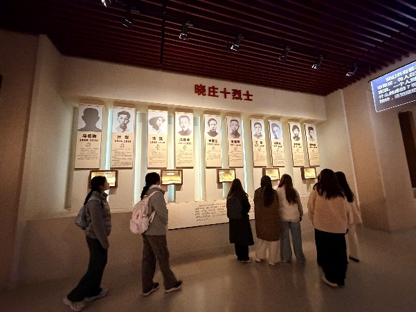 在二楼“晓庄十英烈”展区,十位烈士的照片一字排开,稚嫩的面容上写满了坚毅。“为革命而死,是人生最大的光荣。”一位烈士的遗言镌刻在墙上,字字千钧。同学们不约而同地放慢脚步,作为晓庄人,十英烈的精神早已融入血脉,此时此地更加激发了以英烈为榜样的强烈情感与勇担时代使命的责任感。