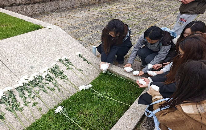 告别纪念馆,一行人沿着中轴线向北行进,来到巍峨的烈士纪念碑前。纪念碑高耸入云,邓小平同志题写的“雨花台烈士纪念碑”八个大字庄严肃穆。正当同学们准备绕碑默哀之际,恰逢团市委组织小学生在此举行庄严的入队仪式。稚嫩的童声齐唱队歌,在纪念碑前回荡。同学们驻足观摩,一张张稚气未脱却神情庄重的小脸,仿佛看到了红色基因在一代又一代人心中生根发芽。同学们感慨道:“孩子们在这里入队,正如我们在这里追思,都是精神传承的最好见证。”随后,队伍前往雨花台安全教育馆、雨花阁和烈士就义浮雕等地,在烈士就义群雕前,同学们自发列队,手持亲手制作的小白花,依次上前,轻轻放在雕像基座前。没有长篇的致辞,没有激昂的口号,只有深深的鞠躬和静静的凝望。小白花在春风中微微颤动,寄托着青年学子对先烈的无尽哀思。