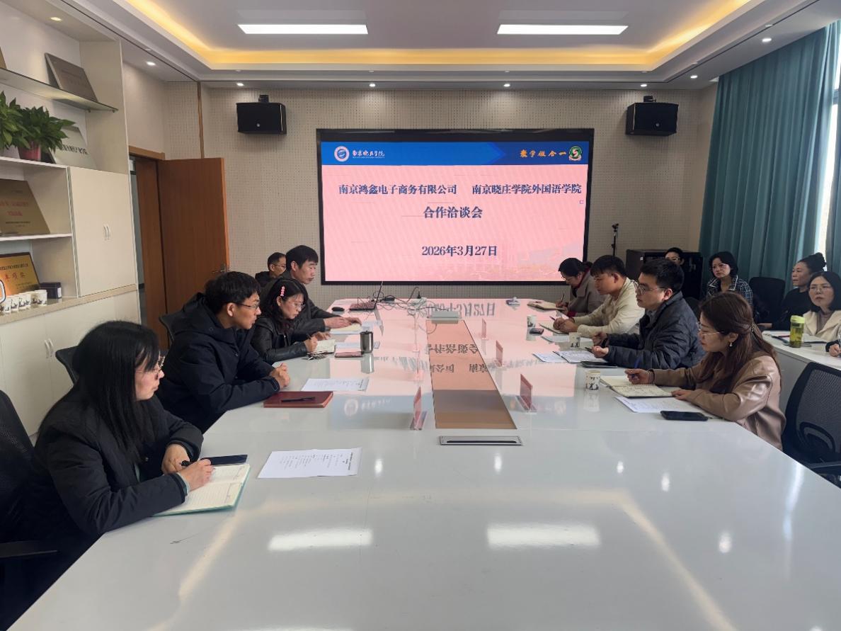 3月27日上午,南京鸿鑫电子商务有限公司代表团到访外国语学院,双方举行校企合作专题洽谈会。院长汪璧辉、院党委副书记马晓亮、副院长沈红伟、院长助理郦珲,以及商务英语、翻译教研室教师代表参会。