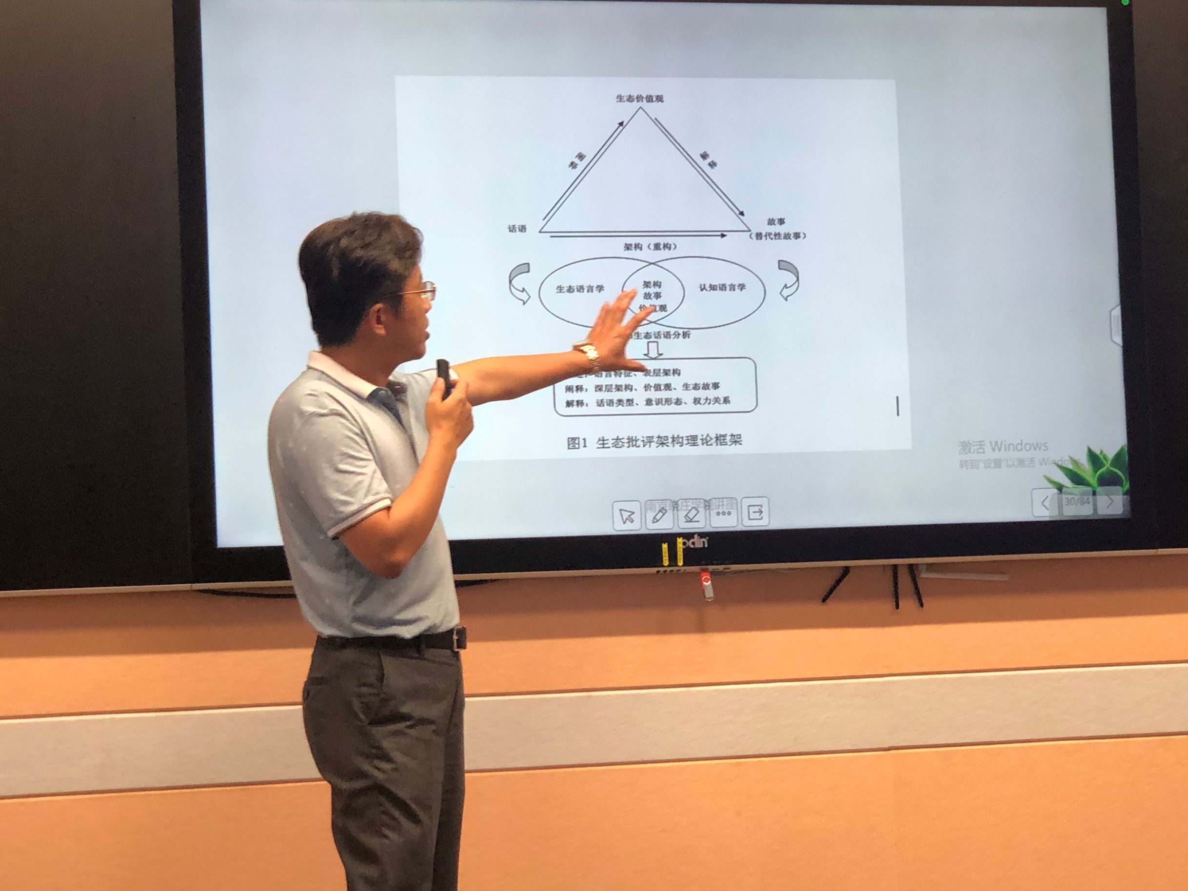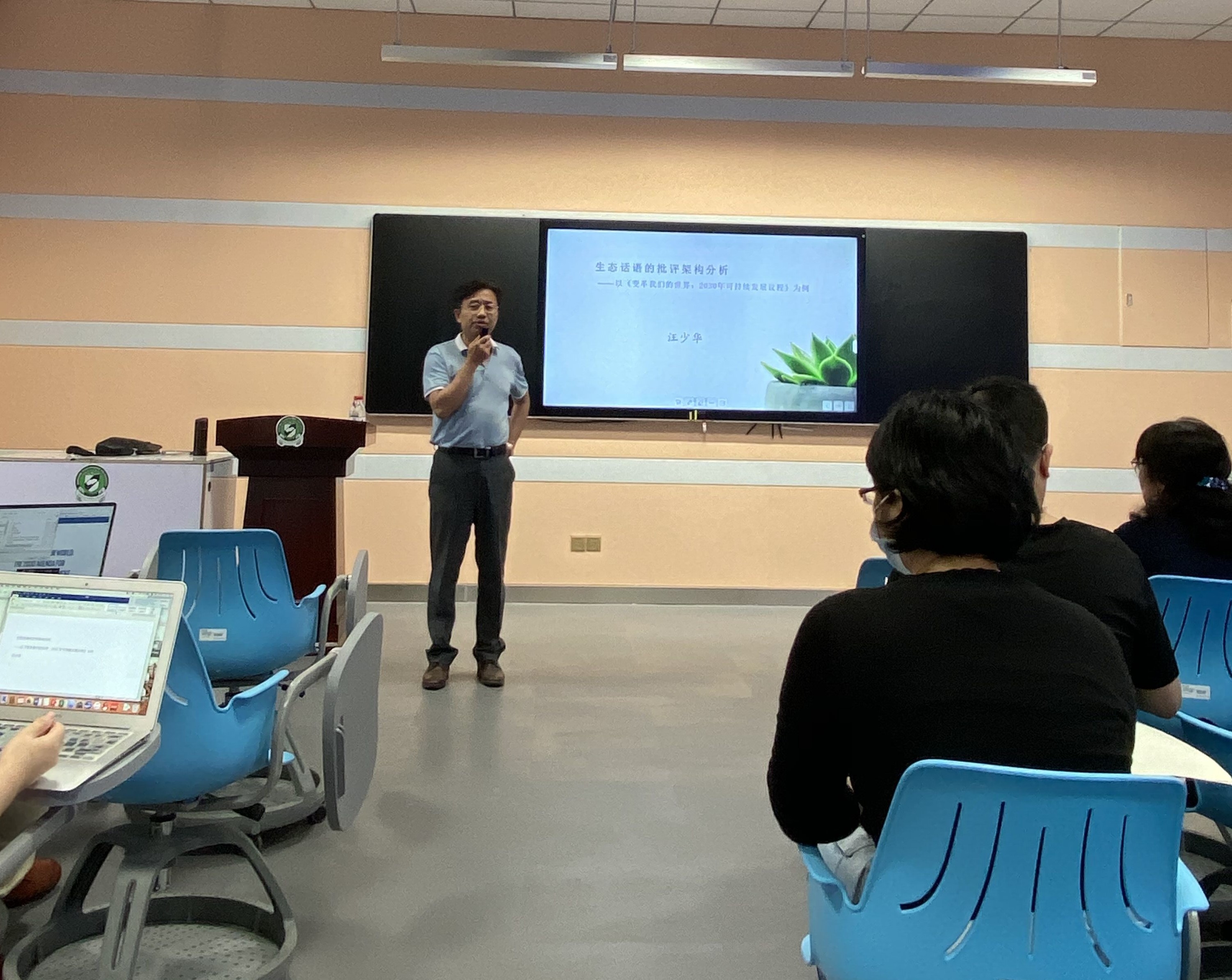 外国语学院特聘院长汪少华教授介绍了自己的研究成果——从生态批评架构的视角分析《变革我们的世界:2030年可持续发展议程》。汪教授详细梳理了生态语言学研究史并提出了生态批评架构理论,结合语料分析探究全球最高决策层建构社会现实和社会秩序的话语策略及其对生态发展的影响,提出基于“生命共同体”的生态思想创建新架构,讲述中国生态故事,为全球生态发展贡献中国智慧。讲座激发了教师们的学术兴趣,在提问阶段,多位教师就“故事”、“reframing”等概念向汪教授请教,探讨了不同研究视角对于同一个词语的不同界定,营造出浓厚的学术氛围。