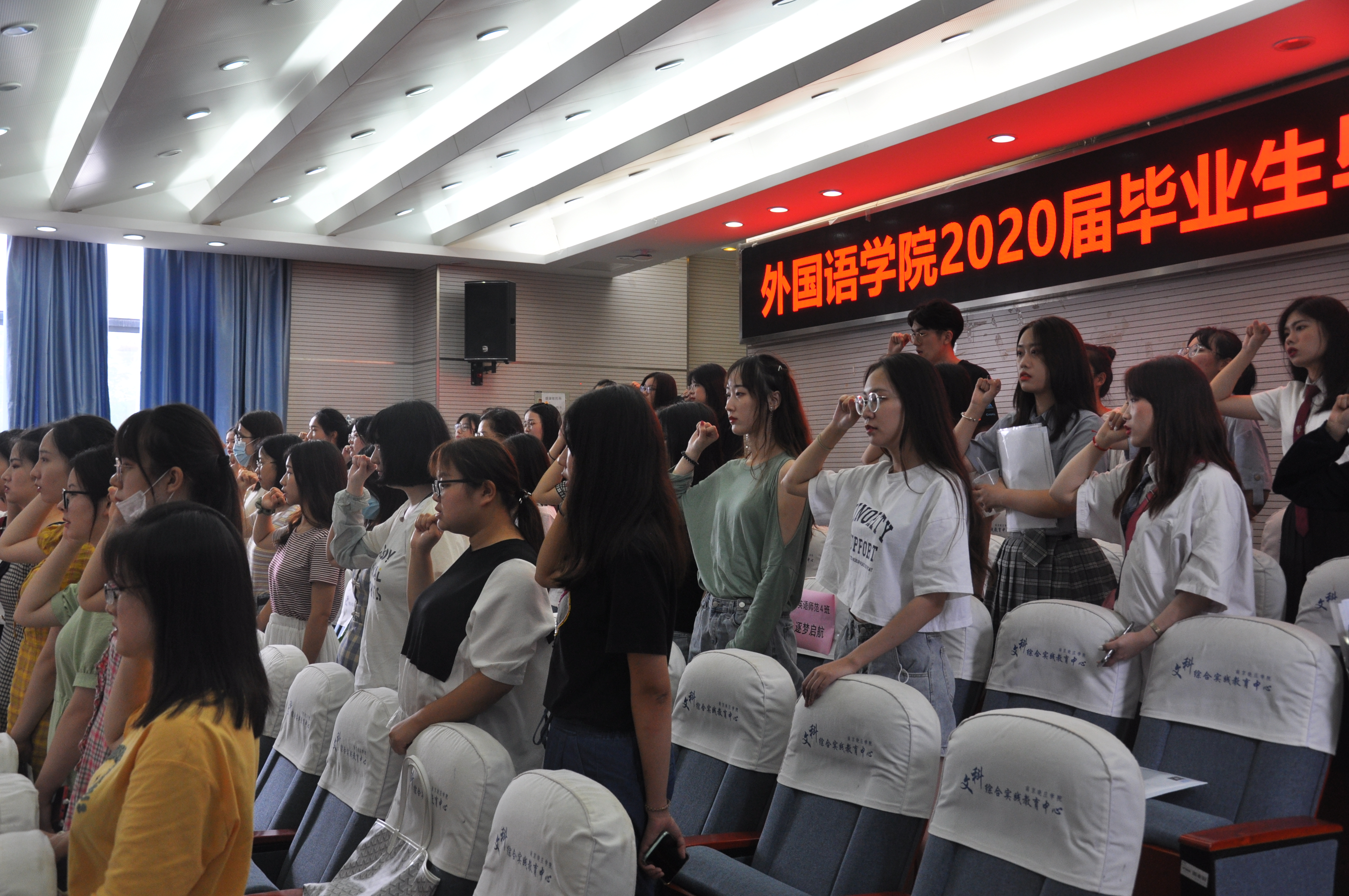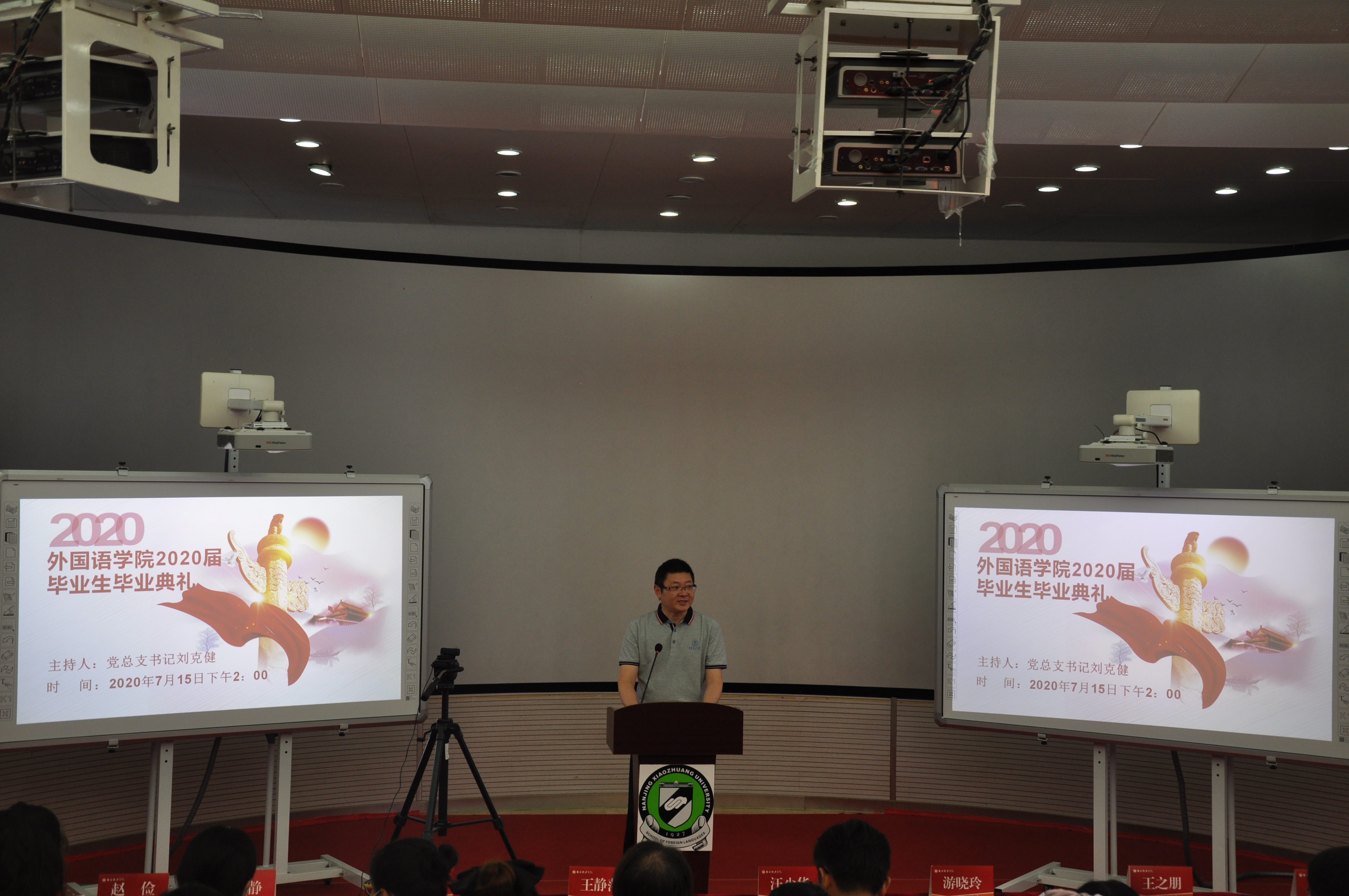 2020年7月15日下午两点,外国语学院在文北200主会场、文北一楼各教室分会场,以“线上+线下”的形式,举行2020年毕业典礼。参加毕业典礼的有执行院长王静萍,特聘院长汪少华,副院长游晓玲,外院教务办、学工办全体老师,全体班主任以及全体2020届毕业生。典礼由学院党总支书记刘克健主持。