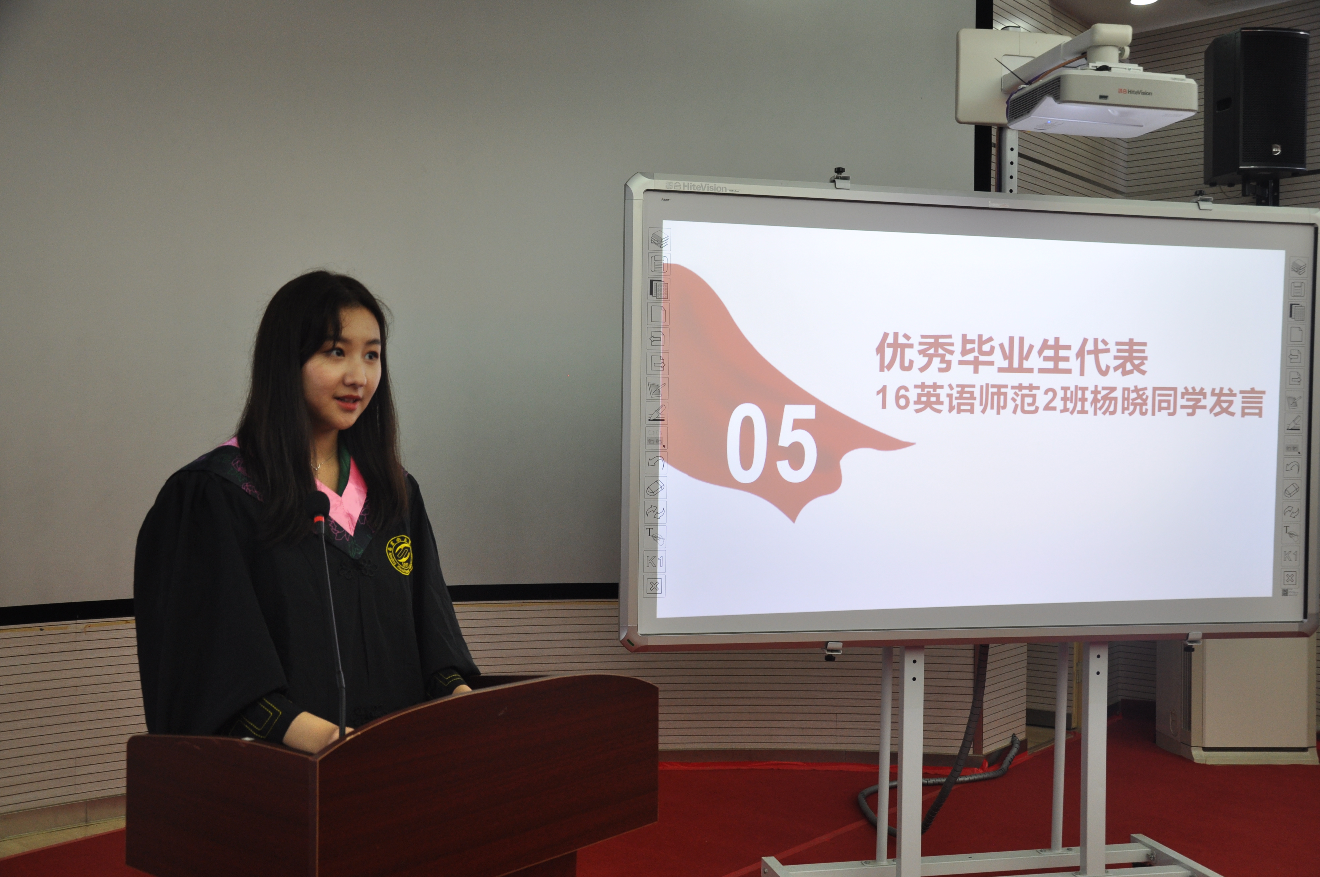 在优秀毕业生代表发言环节,16英语师范2班杨晓同学回忆了大学四年的青春韶华,讲述了求学过程中的困难挫折,表达了对学院和老师们的感激之情,她同时认为,作为外院学子,要“掌握外国语言,讲好中国故事”,真正将个人命运与国家命运相结合。饮水思源,牢记师恩,在今后的岗位上为人民谋幸福、为民族谋复兴。随后,由毕业班班主任代表16英语师范1班、4班班主任赵俭老师发言,她寄语毕业生:第一,大爱无疆;第二,勇于担当、踏实笃行;第三,每天要四问。希望同学们能始终保持一颗平常心,不仅要知书达理,还要学会坚强,敢于创新,坚韧执着,勇敢地迎接人生的每一个挑战和追求卓越。