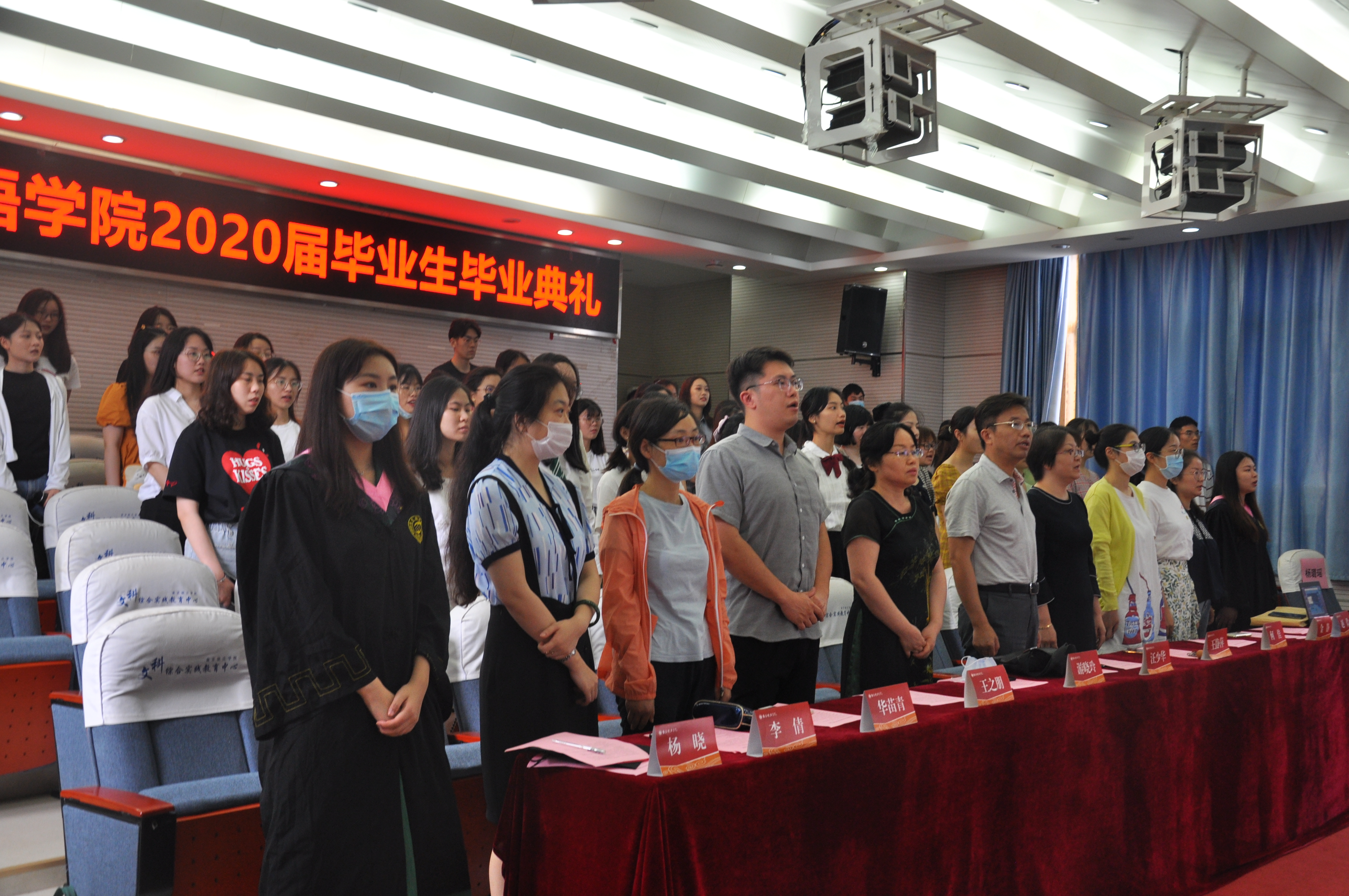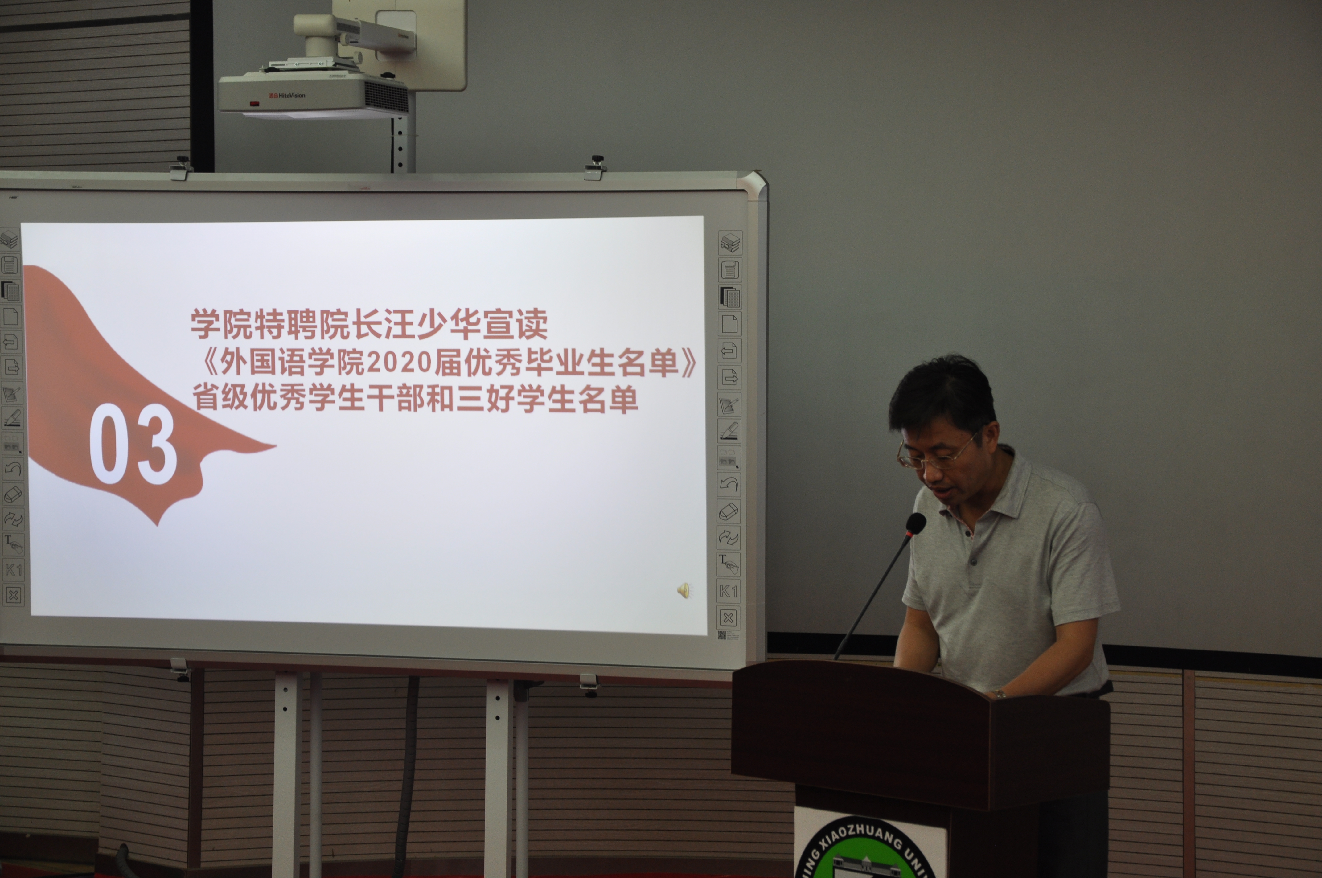 典礼在雄壮的国歌声中开始,刘克健书记隆重介绍了与会的各位领导、老师,并代表学院对各位毕业生顺利完成学业表示最诚挚的祝贺。学院特聘院长汪少华宣读《外国语学院2020届优秀毕业生名单》和《省级优秀学生干部和三好学生名单》,副院长游晓玲宣读校级优秀论文名单。他们勉励获奖毕业生珍惜荣誉,奋发有为,心怀母校,继续前进。