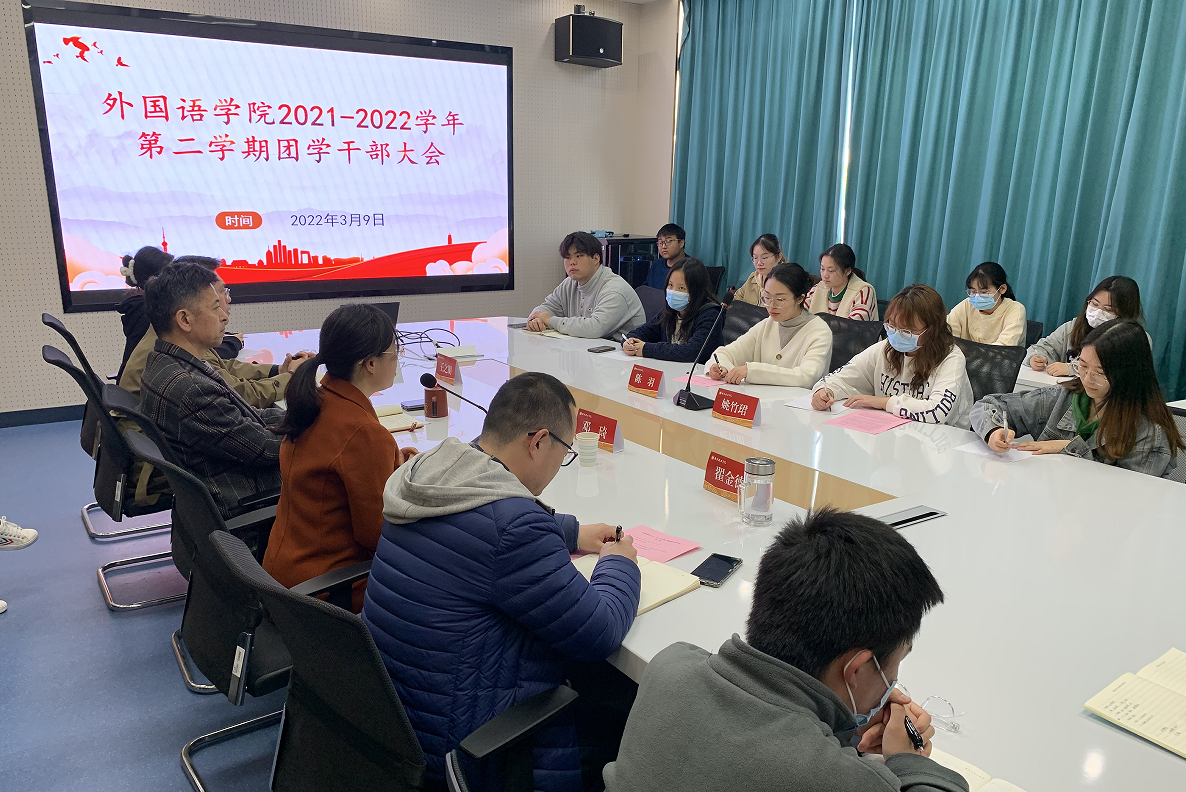 阳春三月,万象更新。外国语学院于3月9日在文北308会议室召开了2021—2022学年第二学期团学干部大会,校团委邓琦书记、院党总支马传浩书记出席此次会议。
