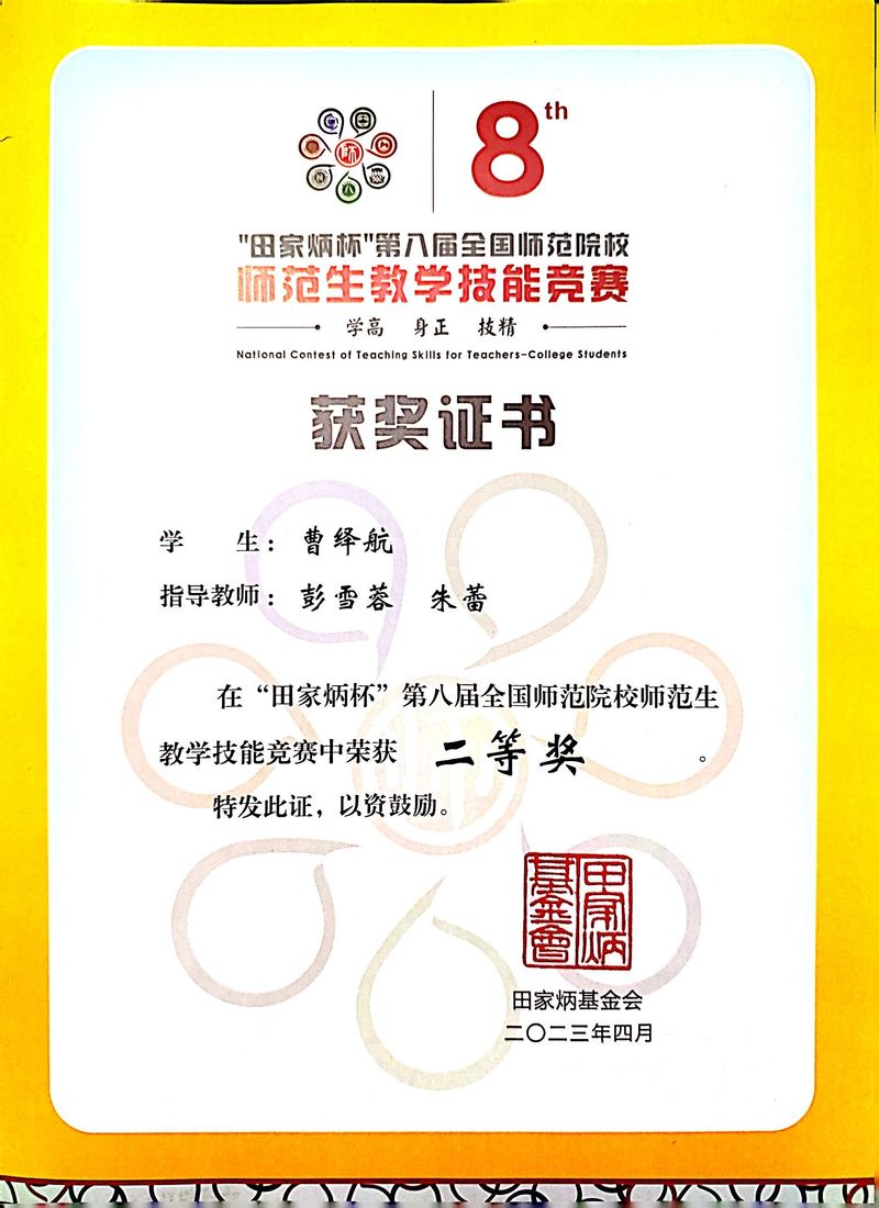 4月14日至16日,“田家炳杯”第八届全国师范院校师范生教学技能竞赛决赛在浙江师范大学举行。本次大赛共有来自全国167所师范院校的988名选手参赛,其中107所师范院校的294名选手入围决赛,决赛涉及专业有汉语言文学、英语、思想政治教育、历史学、数学与应用数学、物理学、化学、生物科学、地理科学等9个专业,最终产生一等奖102名、二等奖192名。本届“田家炳杯”,我校英语和生物两个专业各1名选手入围决赛。现场决赛期间,选手现场抽题,并在两小时内独立完成一节课的教学设计、课件制作和即席演讲的准备,然后进行10分钟模拟授课和3分钟即席演讲。与来自华东师大、东北师大等强劲对手同台竞技,我院曹绎航同学沉着应战,发挥稳定,最终荣获全国二等奖。
