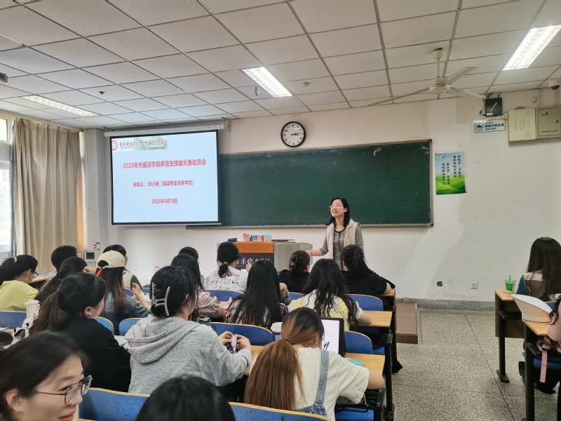 三、外国语学院师范生技能大赛动员大会。4月初,教研室已经组织和开展了师范生技能训练营,通过在全院招募的9名教师对同学们的口语和书法技能进行专项训练。外院的师范生技能大赛将于5月下旬开展,希望同学们能在模拟授课、二笔字和综合语言技能等方面不断磨练、精进技能,为接下来6月份的南京晓庄学院第十七届师范生技能大赛,以及江苏省第十二届师范生技能大赛做好准备。