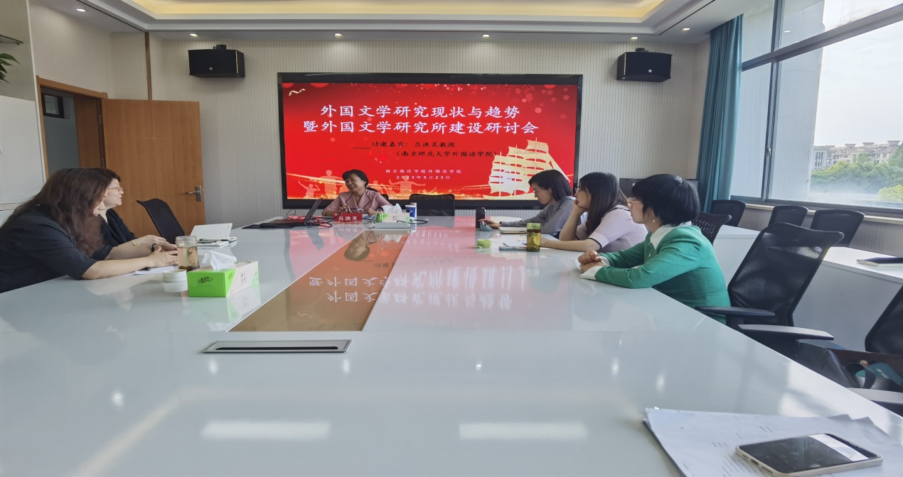 吕洪灵教授此行的另外一个重要议程是为我院新成立的“外国文学研究所”作题为《外国文学研究现状与趋势——外国文学研究所建设研讨会》的专题讲座,开启了该研究所名家导航系列讲座的新篇章。外院王静萍院长主持会议,汪璧辉副院长和数位专业方向为外国文学的教师一并出席会议。讲座中,吕教授分析了新文科建设背景下进行跨学科、跨领域研究的必要性和目前外国文学研究中的热点问题。此外,她详细介绍了新形势下外国文学研究的八大主流趋势,包括新时代现实主义文学研究、共同体文学研究、跨文明互建视域下的外国文学研究、与科技相关的外国文学研究、消费文化与都市文化的研究、后“9.11”文学、生态文学研究和跨媒介文学研究。吕教授专业、细致的讲座让与会的老师们耳目一新,老师们也就实际遇到的问题与吕教授进行了交流和反馈,活动效果良好。