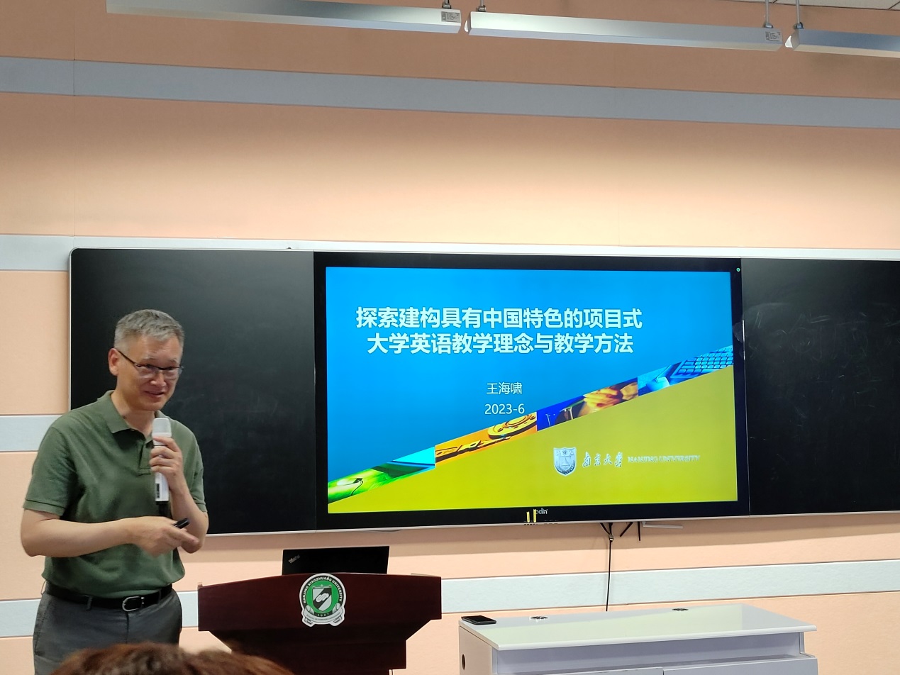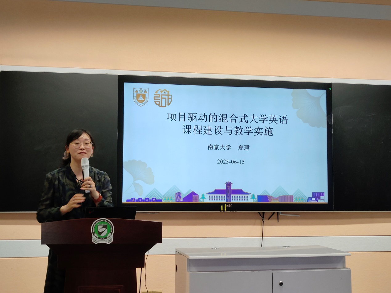 2023年6月15日,外国语学院举办了“项目式语言教学”工作坊,特邀南京大学王海啸老师和夏珺老师为外院教师作了题为《项目驱动的混合式大学英语课程建设与教学实施》的报告。