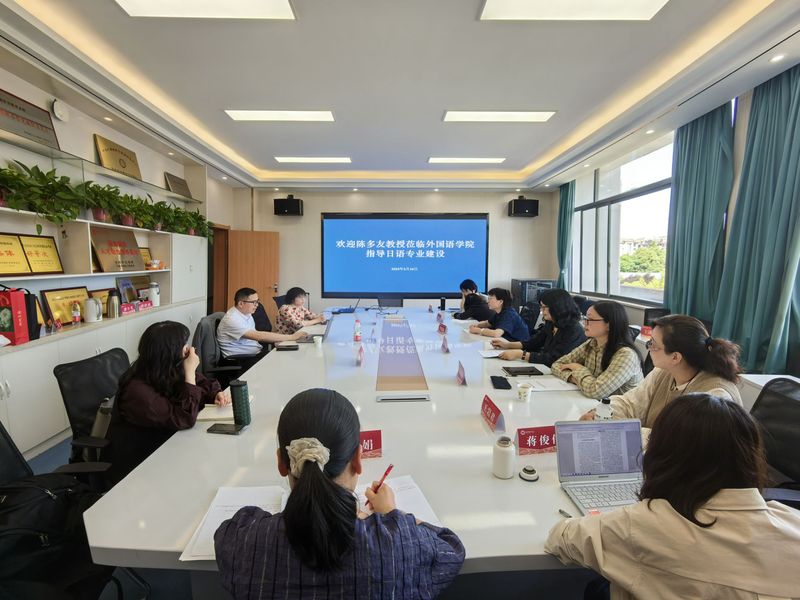 2024年5月16日,广东外语外贸大学日语语言文化学院院长、教育部高等学校外国语言文学类教学指导委员会日语分委员会会长陈多友教授应邀来我校指导日语专业建设工作。会议由日语专业负责人潘小英主持,外国语学院王静萍院长、汪璧辉副院长及日语教研室全体教师出席此次研讨会。