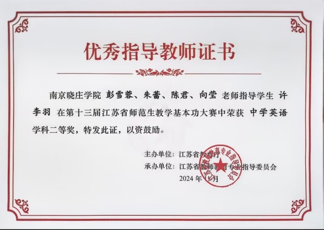 10月25日至27日,由江苏省教育厅主办、省教师教育专业指导委员会承办的第十三届江苏省师范生教学基本功大赛(中学文科组)在江苏第二师范学院举办。我院英语(师范)专业的许李羽同学荣获中学英语组二等奖,丁若妍同学荣获中学英语组三等奖。